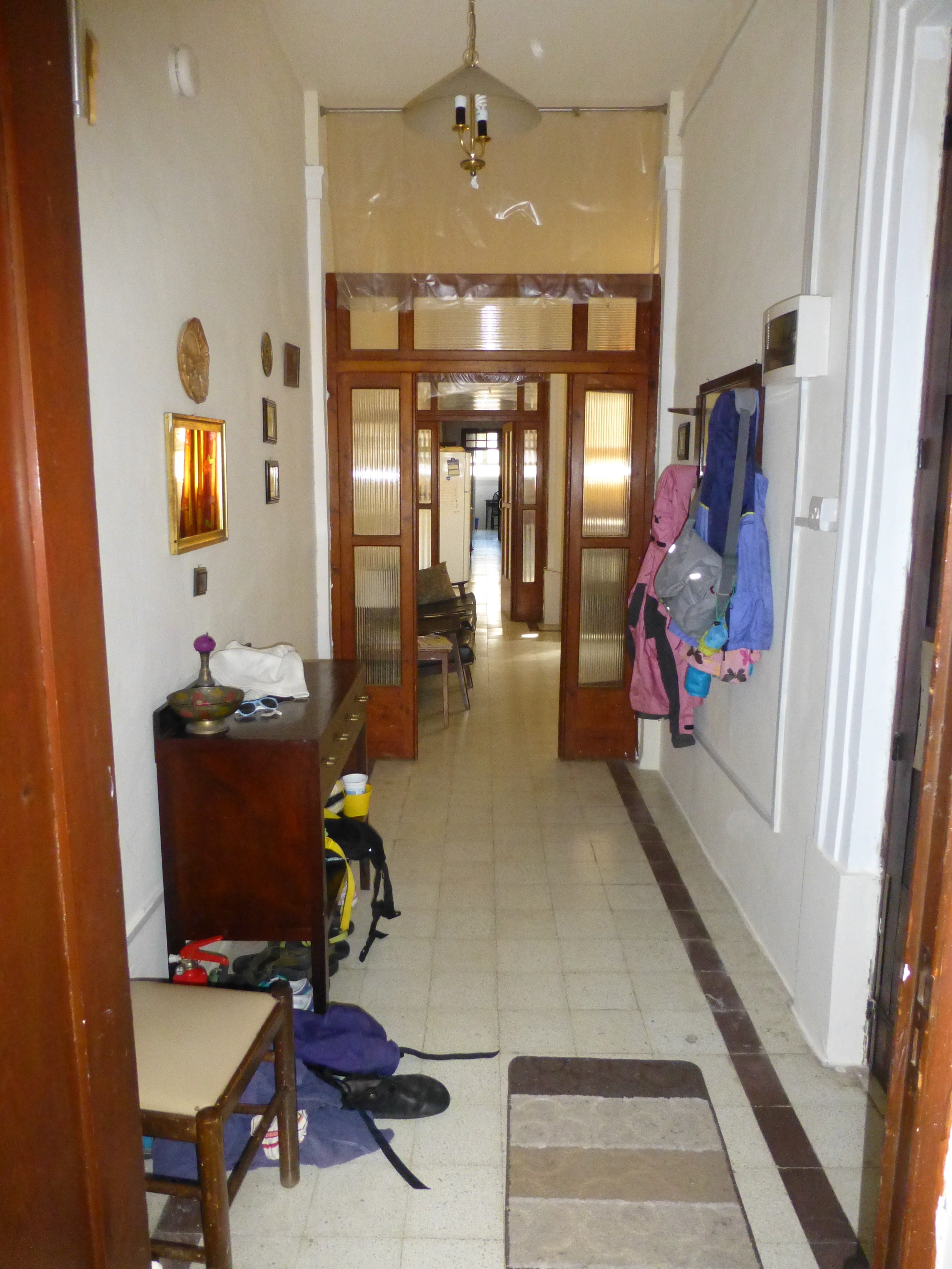 First, you must walk up 4 flights of stairs, or 60 steps. Ready? The building is made of limestone and the flats all have high ceilings – both are ways to keep it cool in the summer. Incidentally, those same features keep it cool in the winter as well. 😦
