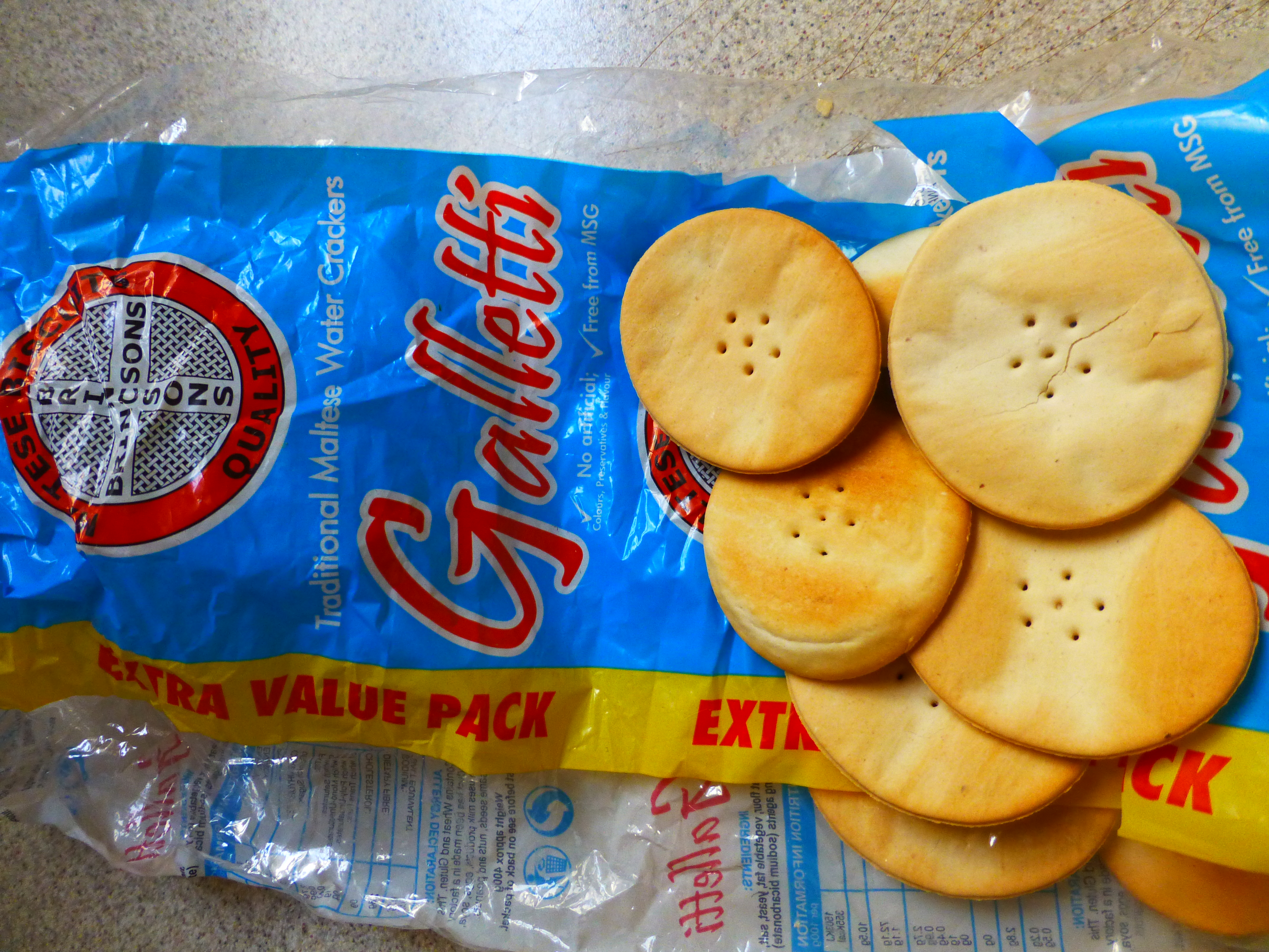 Maltese water crackers called Galletti. They are great with bigilla, a traditional Maltese dip made of dried broad beans. Fabulous combo!