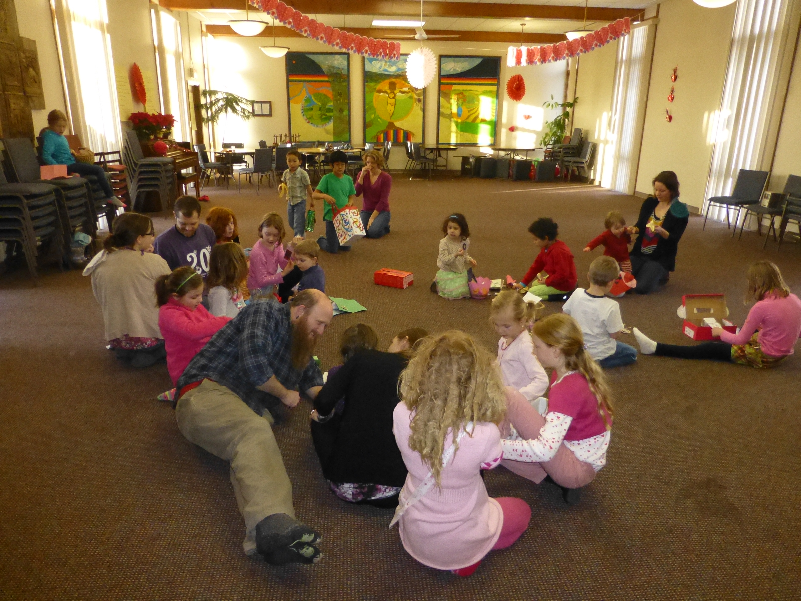 February 14 – Valentine’s Day and the Pleasant Valley Valentine Party. We love this party! The kids just finished exchanging Valentines and now they are looking through their boxes.